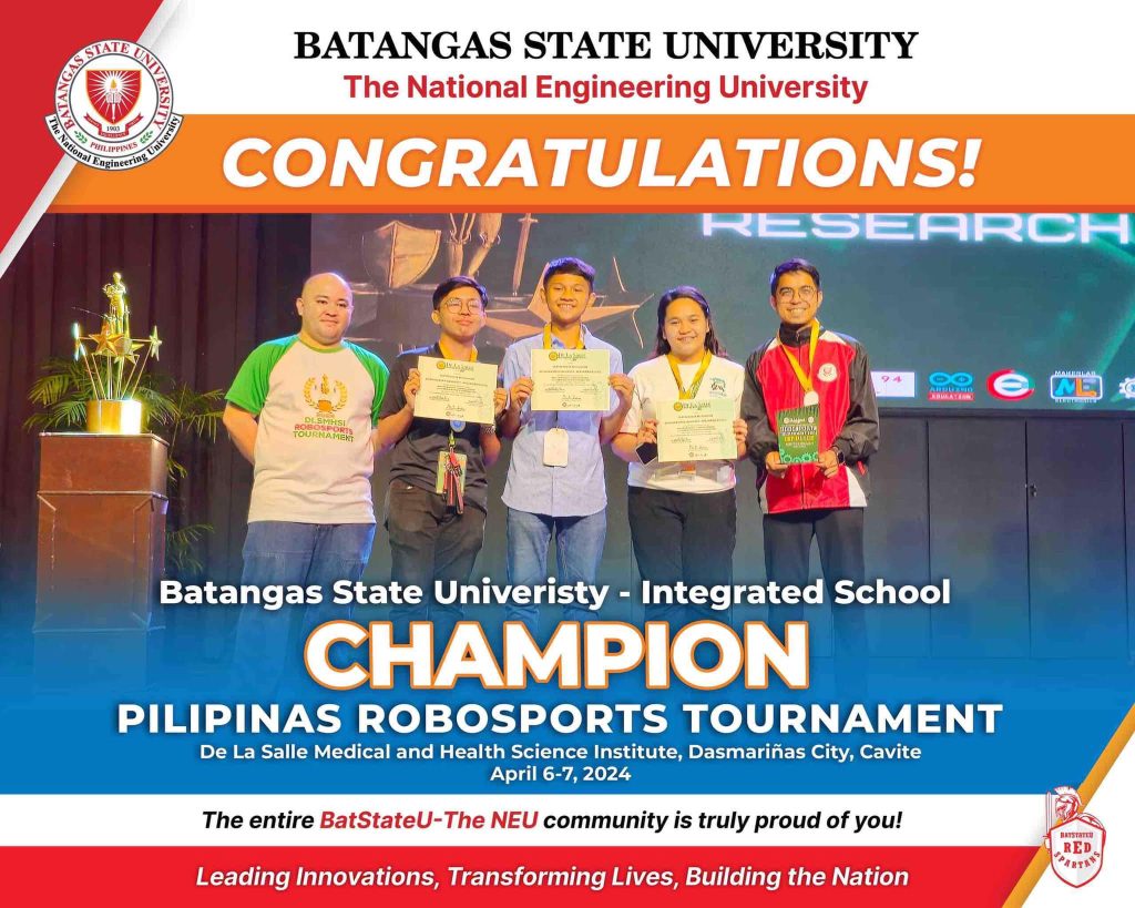 The Batangas State University Integrated School (Batangas IS) has reaffirmed its dominance in robotics by clinching significant success at the Pilipinas RoboSports tournament. Held at the De La Salle Medical and Health Sciences Institute in Dasmariñas City, Cavite, on April 19, the Batangas IS robotics innovators emerged as the Champion, outperforming other teams in the country.