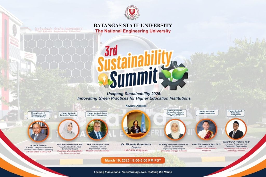 Batangas State University (BatStateU), The National Engineering University of the Philippines, strengthened its commitment to sustainability by hosting its 3rd Annual Sustainability Summit on March 19, 2025. The event, themed “Usapang Sustainability 2025: Innovating Green Practices for Higher Education Institutions,” took place at Narra Hall, 5/F of the Jose Rizal Building at the Pablo Borbon Campus.