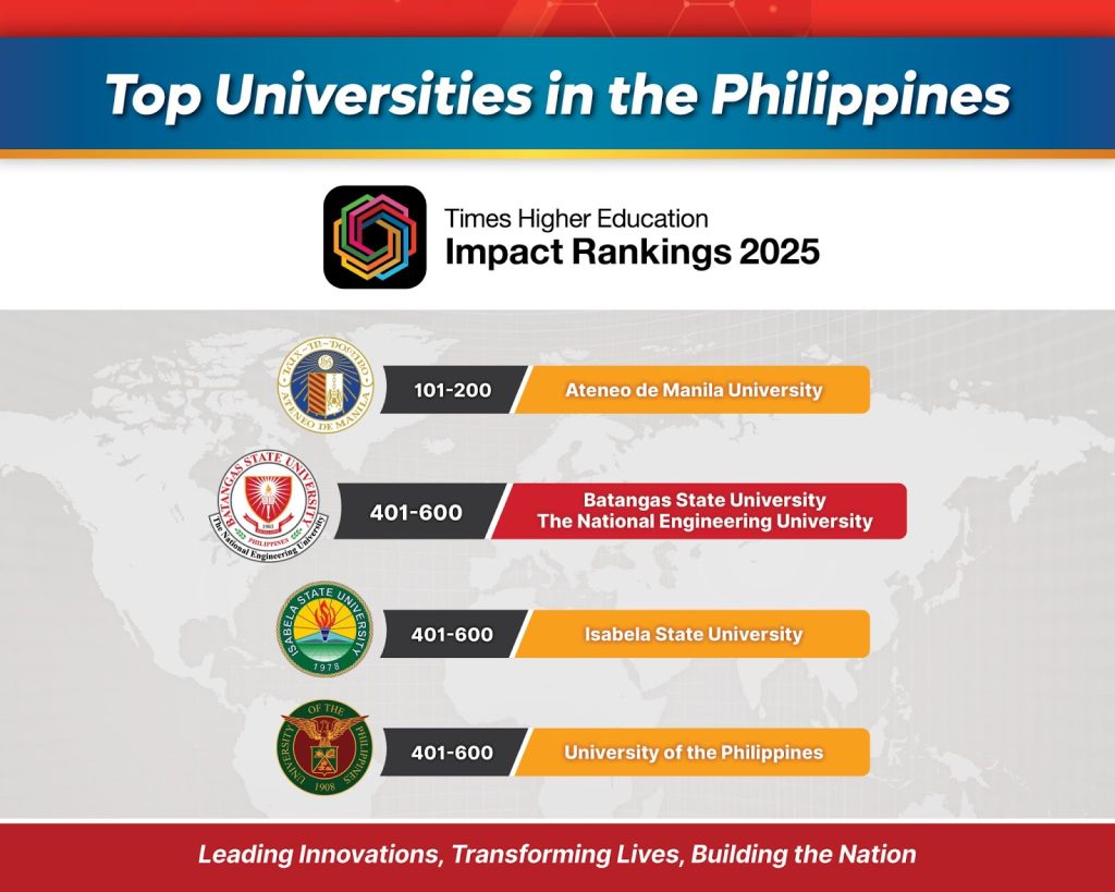 Strengthening its commitment to advancing the United Nations (UN) Sustainable Development Goals (SDGs), Batangas State University, The National Engineering University (BatStateU The NEU), has made a significant leap in the 2025 Times Higher Education (THE) Impact Rankings, rising from the 601–800 band to the 401–600 band out of 2,318 participating universities worldwide, as announced on June 18.